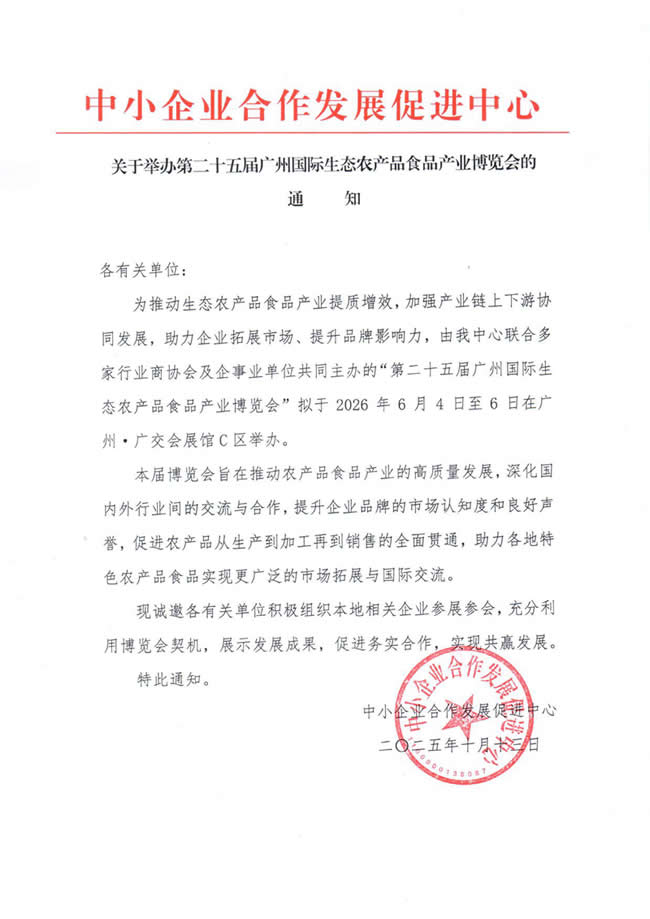 为推动生态农产品食品产业提质增效,加强产业链上下游协同发展,助力企业拓展市场、提升品牌影响力,由我中心联合多家行业商协会及企事业单位共同主办的“第二十五届广州国际生态农产品食品产业博览会”拟于2026年6月4日至6日在广州·广交会展馆C区举办。